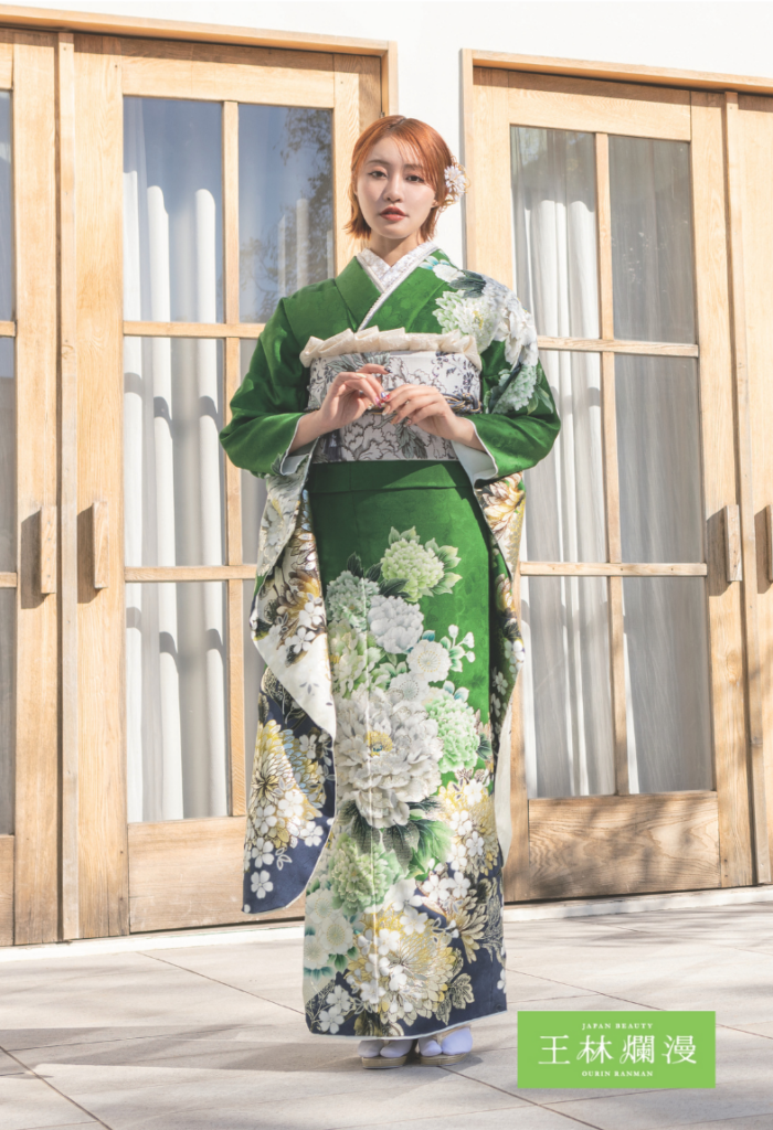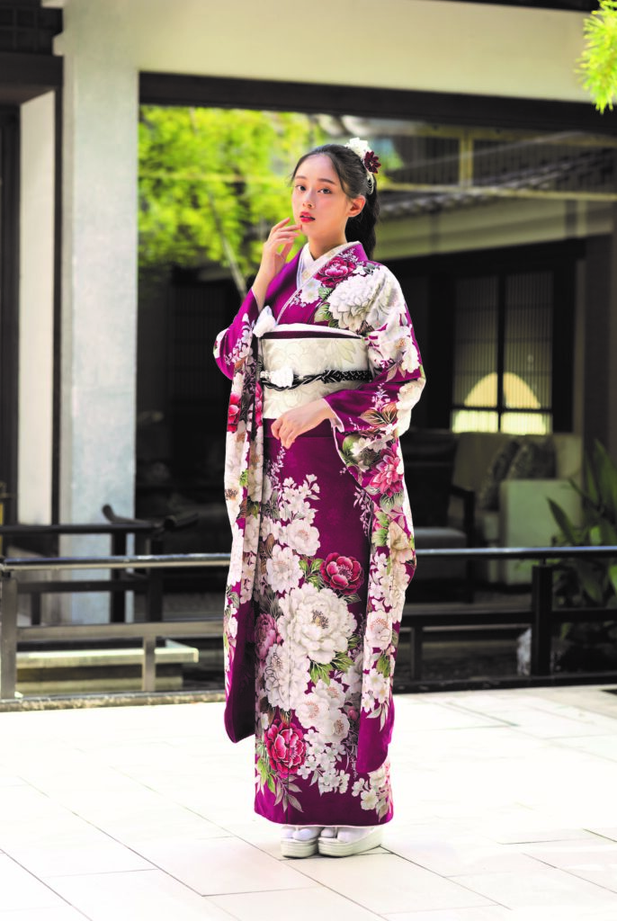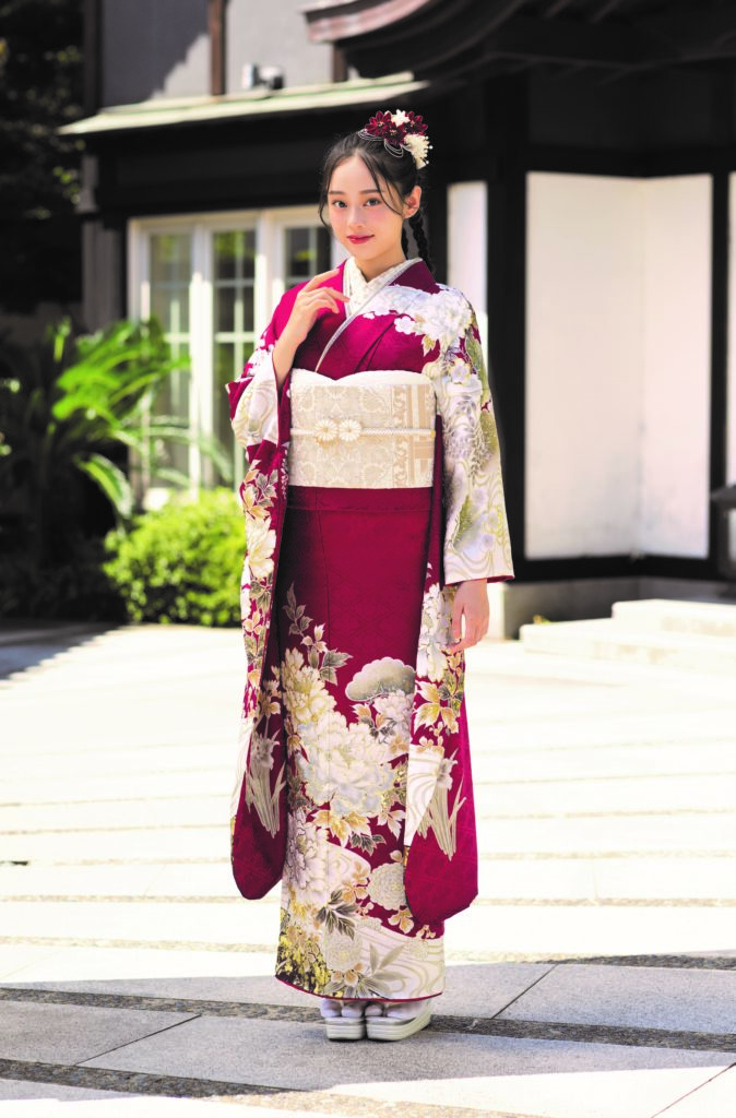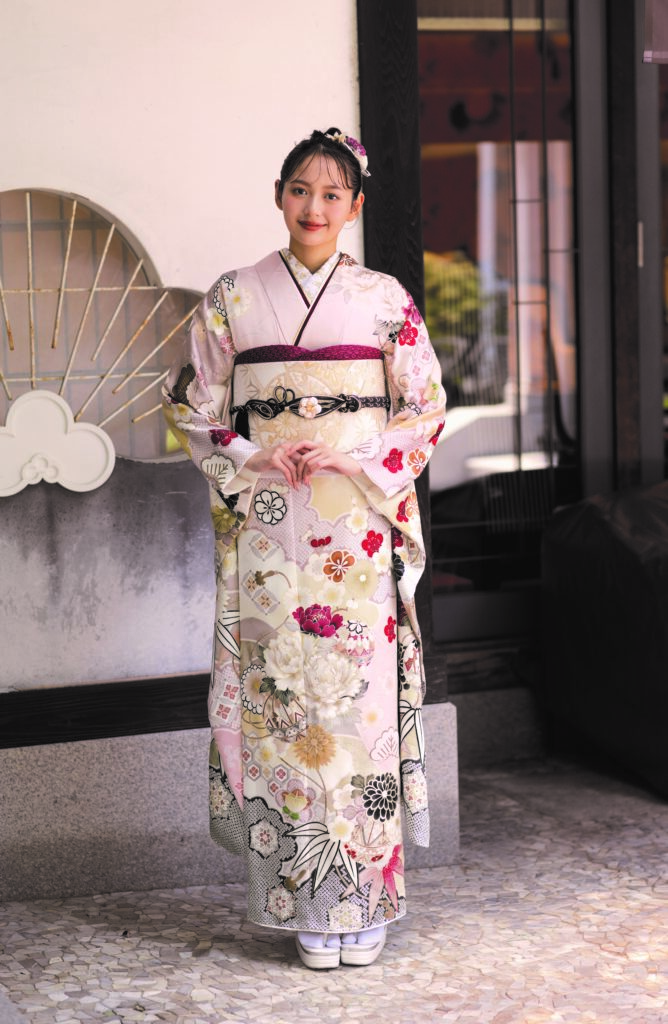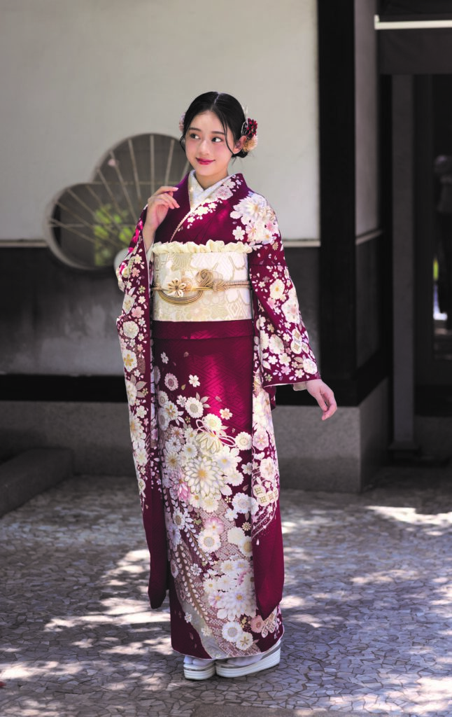繁栄を象徴する柄と、 華やかに咲く花々が 印象的。