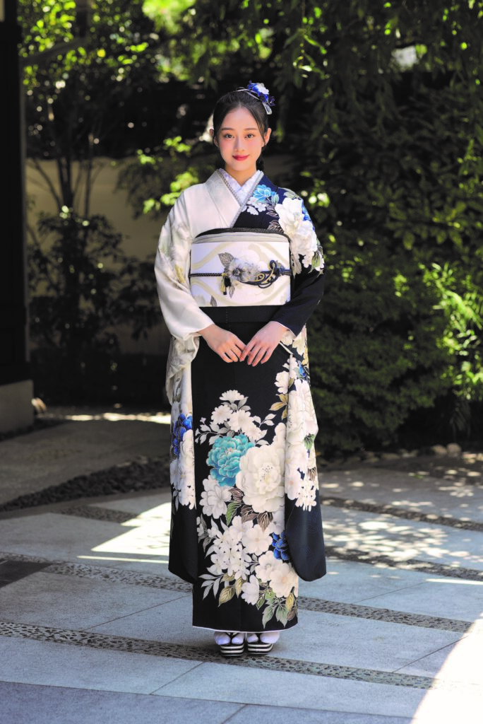 落ち着きのある紺でも 鮮やかに彩る牡丹が特徴。